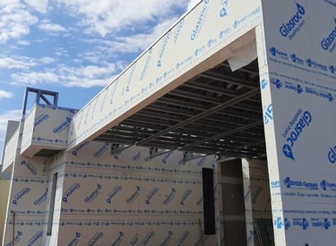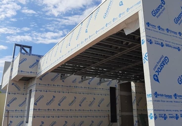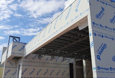 Diferente do drywall comum, o Glasroc possui revestimento de fibra de vidro, garantindo maior resistência à umidade.